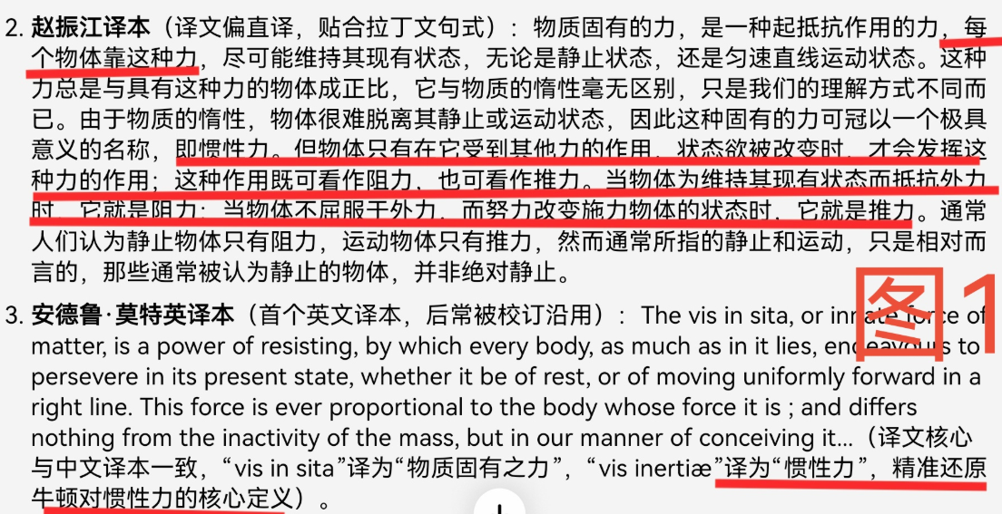 - 给出了惯性力的特征:“但物体只有在它受到其他力的作用,状态欲被改变时,才会发挥这种力的作用;这种作用既可看作阻力,也可看作推力。”