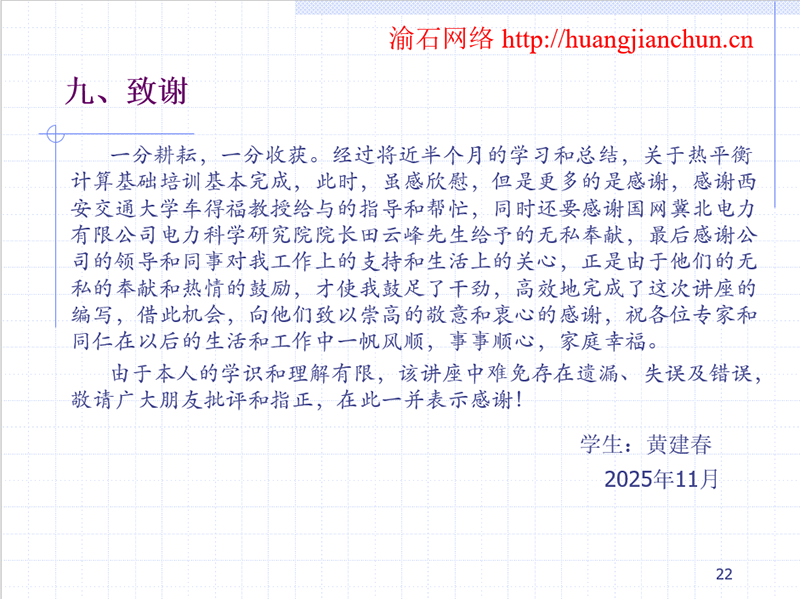 该PPT于2025年11月完成,主要是作为企业的培训文件,该ppt主要是一个提纲,讲解的内容主要是讲解我软件中的计算思路及方法,作为我所做的PPT来说,该PPT是本人做得最好的PPT,整个PPT采用了模板型式搭建,其改动和输入都非常方便。最后,希望您在转载时一定要标明出处,请尊重我的劳动成果,在此,我对所有关注渝石网络的朋友表示衷心的感谢,另外还要特别感谢国网冀北电力有限公司电力科学研究院院长田云峰先生给予的无私奉献。