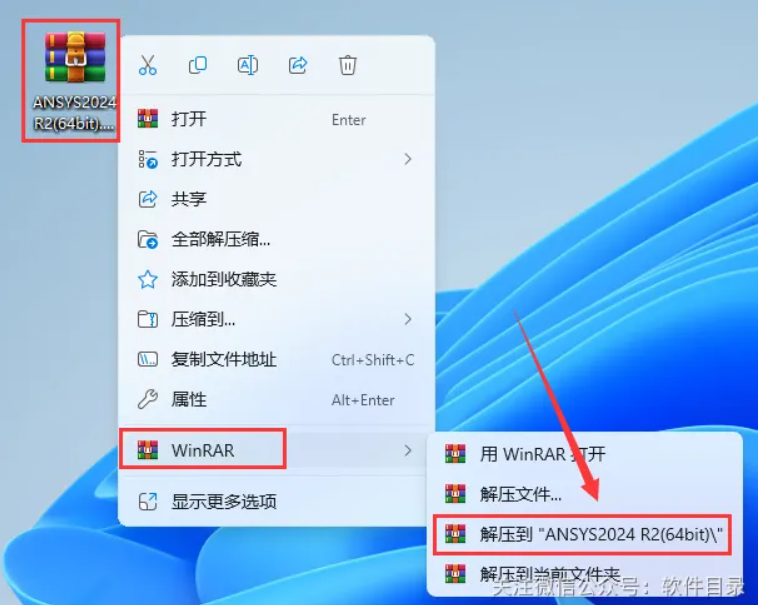 1.解压安装包:①鼠标右击【ANSYS2024 R2(64bit)】压缩包②选择电脑上安装的解压软件(如:WinRAR)③点击【解压到ANSYS2024 R2(64bit)】。