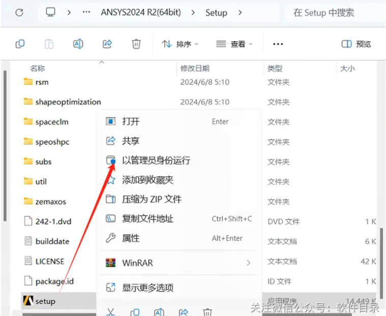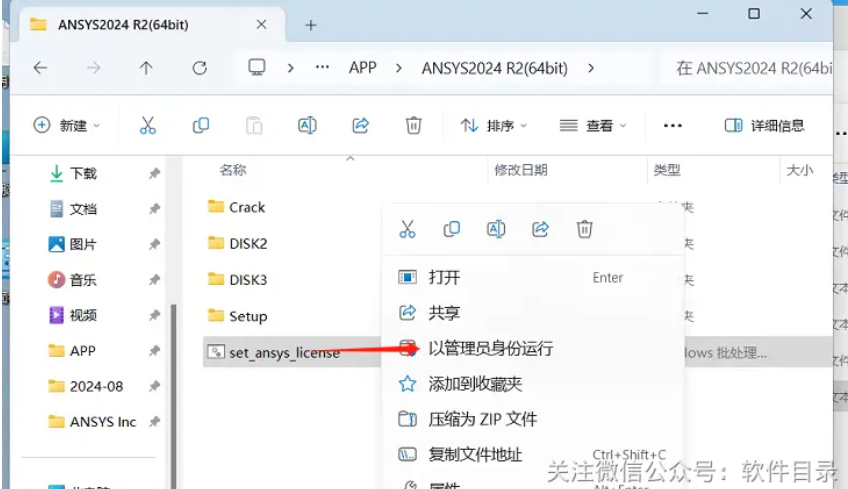 24.打开安装包解压后的【ANSYS2024 R2(64bit)文件夹。鼠标右击【set_ansys_license】选择【以管理员身份运行】。(运行完成会自动关闭)