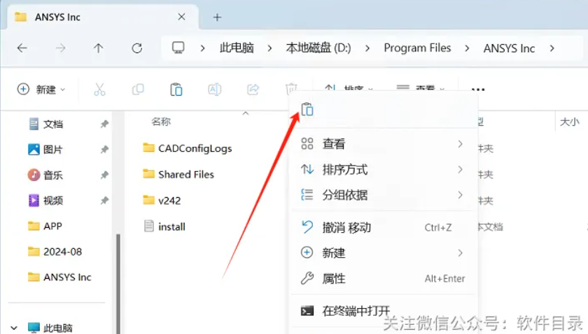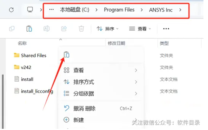 17.打开安装路径位置【C:\Program Files\ANSYS Inc】,鼠标右击空白处选择【粘贴】。