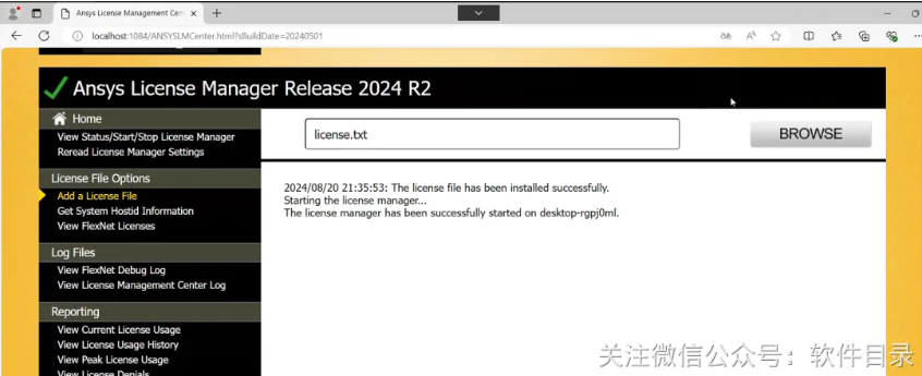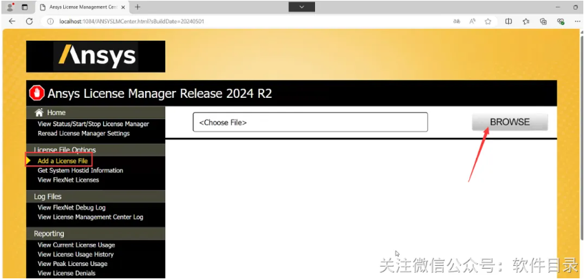 20.回到步骤12中的页面,点击【Add a License File】,点击【BROWSE】。