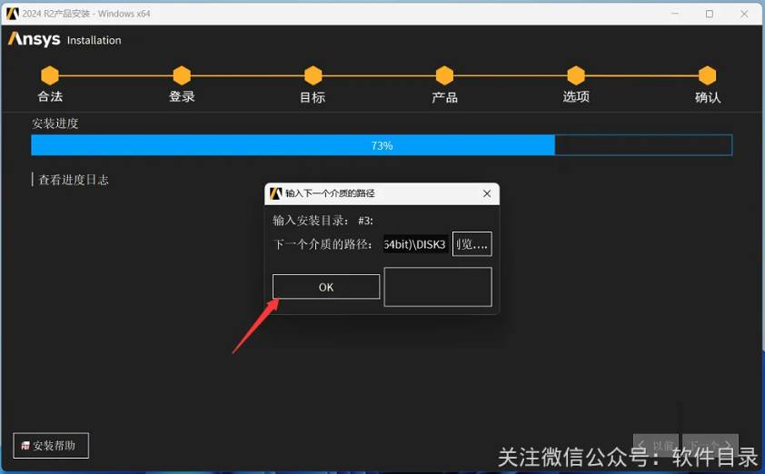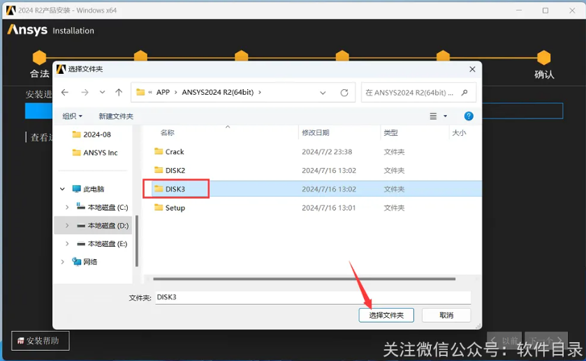 38.选择安装包解压后的【ANSYS2024 R2(64bit)文件夹中的【DISK3】,点击【选择文件夹】。
