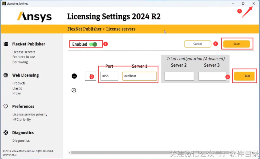42.配置Enabled:①点击【Enabled】开关②输入”Port 【1055】"Server"【localhost】③点击【Test】④点击【Save】⑤点击右上角【X】关闭。