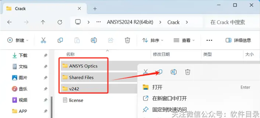 16.打开安装包解压后的【ANSYS2024 R2(64bit)】中的【Crack】文件夹,全选里面所有内容鼠标右击选择【复制】。