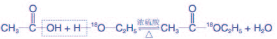 羧酸和醇在酸催化下可以发生酯化反应,即羧酸中的羟基与醇发生脱水反应。如乙酸与乙醇在浓硫酸催化和加热的条件下反应,乙酸分子中羧基上的羟基被乙氧基(—OCH2CH3)取代后生成的乙酸乙酯。反应式如下图所示: