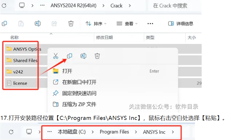 17.打开安装路径位置【C:\Program Files\ANSYS Inc】,鼠标右击空白处选择【粘贴】。