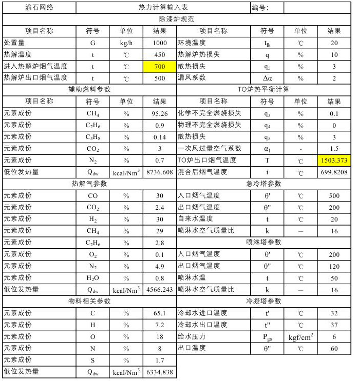 根据计算要求,在网上对易拉罐除漆炉的相关计算进行了详细的查询,很可惜,网上几乎没有相关的参考资料,最终根据自己的经验选择了焦炉煤气的热平衡计算作为参考,并在我以前编写的《工业垃圾回转窑焚烧热力计算及尾气排放预测》计算软件和《生物质气化炉热力计算》计算软件的基础上,对易拉罐除漆热解系统所相关的设备及系统进行了全面的计算,在三天内解决了长期困扰公司的热解气计算的难题,同时也为公司以后进行热解炉热平衡计算提供了方法和步骤,解决了公司十几年以来的难题。本来想在20天内完成该软件的编制,但是突然发现该公司有几个人特牛,连cad都不会画图的人还特瞧不起我的水平,说什么公司招我过来不是专门搞计算的,仿佛他画图比我厉害似的,因此为了杀杀这些人的锐气,就加快了软件编写的进度,见证了我前总经理侯典峰先生说的一句至理名言,“不管在哪里,首先要把这些人给镇住,不然他们将来要欺负你的”。该软件是目前国内唯一公开的热解系统计算软件,有着极强的参考价值,在此次计算中,站长对该问题进行了举一反三,提出了全新的思路及计算方法,估计该计算方法和思路连很多985的教授都不一定知道,所以希望你在参考该软件的时候,别忘了给渝石网络点个赞,谢谢!如果你觉得有更好的思路,可来信联系站长。最后真诚地希望广大网友对该软件提出合理的建议,在此站长将对你的建议和意见表示衷心的感谢。